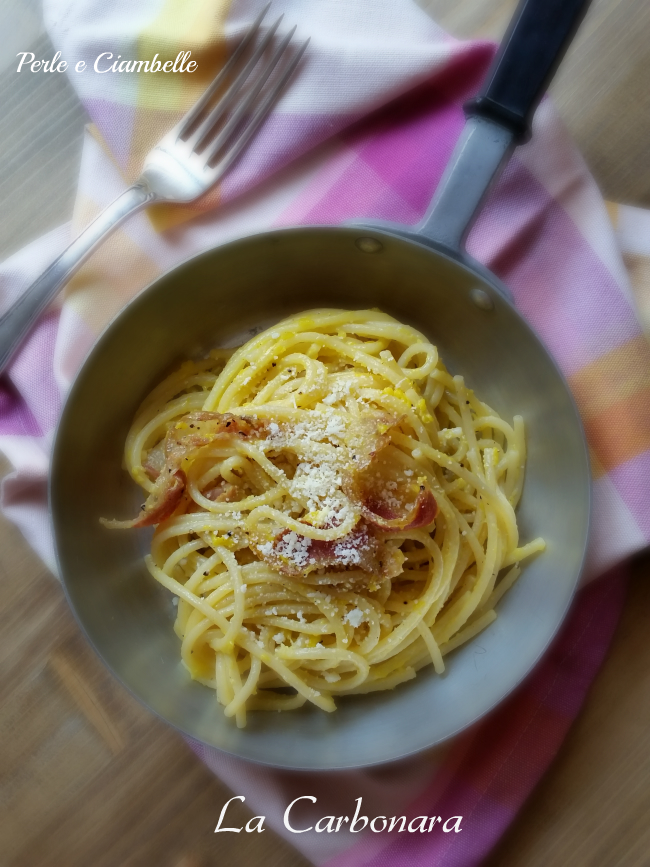 Come avrete letto già nei giorni scorsi anche sul mio blog, il Calendario del cibo Italiano è un progetto AIFB che si propone di diffondere la cultura gastronomica dell’Italia tutta, attraverso il racconto dei nostri piatti tipici e dei nostri prodotti gastronomici. Impossibile trovare qualcuno che almeno una volta nella vita non ha avuto il grande piacere di deliziarsi con una carbonara! Tra le ricette più “massacrate” del nostro patrimonio gastronomico a lei è riservato un posto d’onore : non si sa chi l’abbia inventata, non si sa bene dove essa sia nata, ma l’unica cosa certa è che la carbonara nel corso degli anni si è guadagnata il consenso di moltissime papille gustative! Cercare la “vera carbonara” è un impresa praticamente impossibile, chi la prepara con le uova, chi solo con ii tuorli, alcuni preferiscono unire del parmigiano, altri usano rigorosamente il pecorino romano! Insomma, inutili le diatribe su questa ricetta, ma di certo non è inutile mettersi ai fornelli e prepararla per pranzo! Scommetto che avete già l’acquolina in bocca…..bene! Allora passate a leggere sul sito AIFB tutte le curiosità su questa ricetta, e come la preparo io cliccando qui….e Buona Carbonara a tutti!