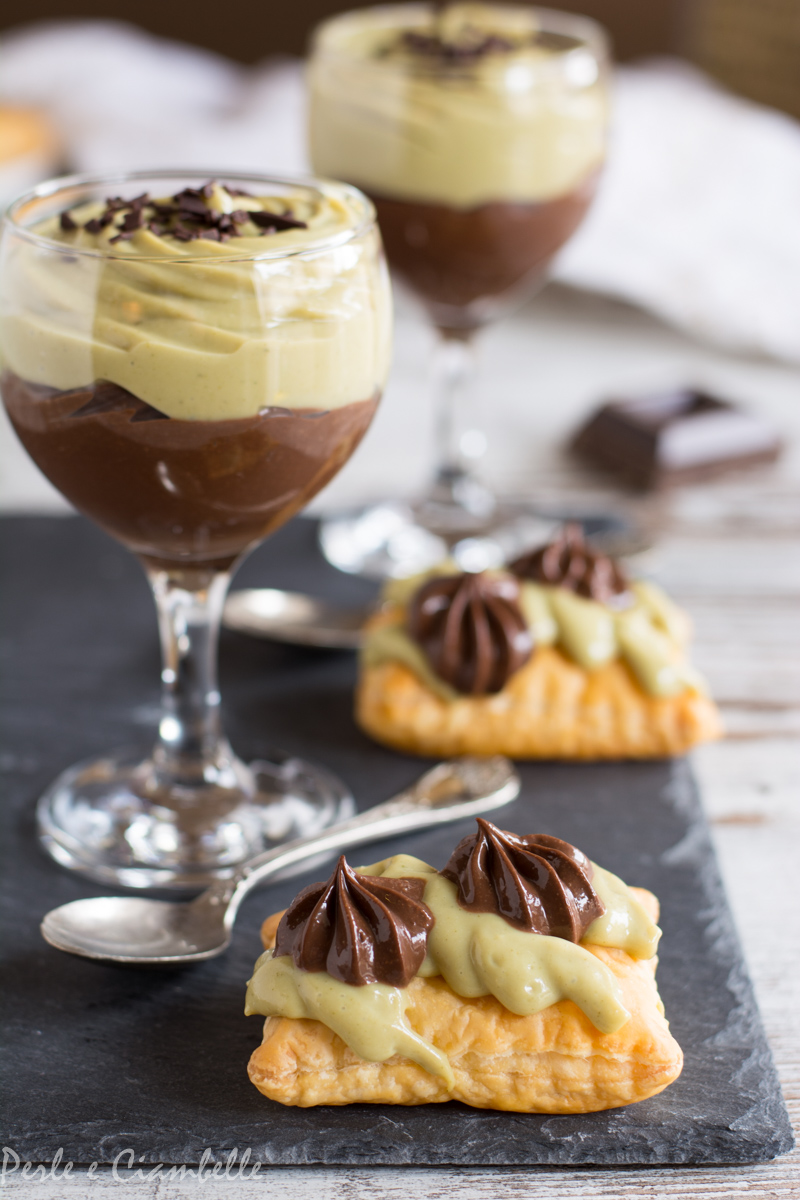 Una volta che entrambe le creme saranno fredde e pronte, con l’aiuto di una sac a poche, riempite le coppette alternandole l’una sull’altra. Decorate a piacere con del cioccolato fondente.