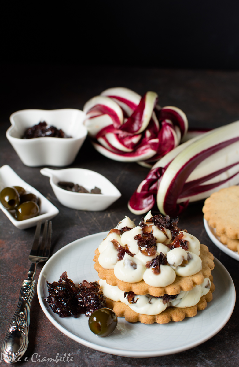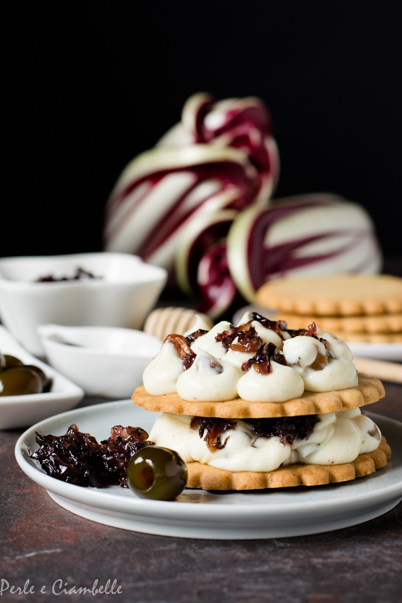 Prendete un biscotto alla nocciola, guarnite con la namelaka e con qualche cucchiaino di radicchio caramellato, coprite con un altro biscotto e poi ancora namelaka e una generosa porzione di radicchio caramellato a guarnire il tutto.