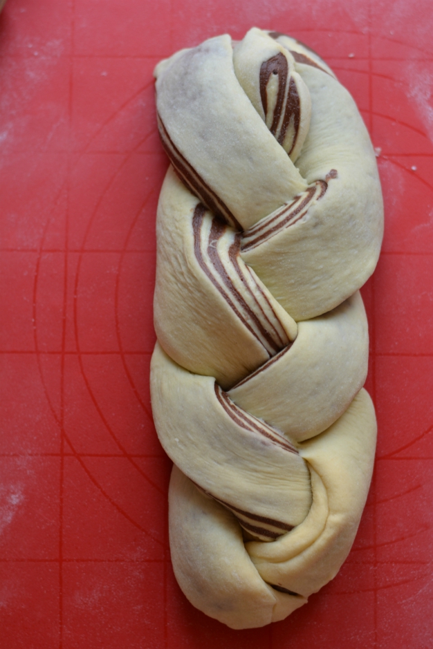 Sovrapponete l’impasto al cacao a quello bianco, ripiegate a metà ( a libro ) e con l’aiuto di un mattarello comprimete gli strati.
