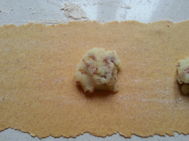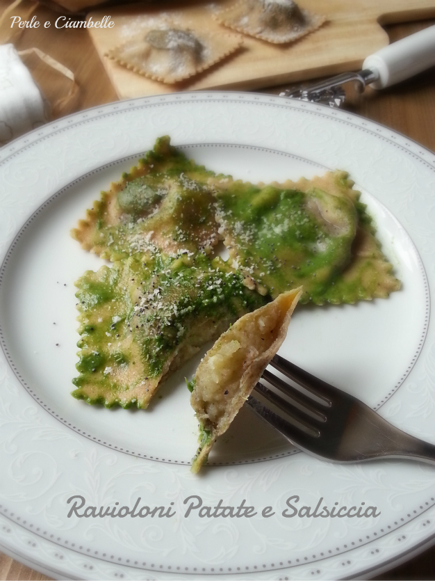 PROCEDIMENTO : Impastate la farina con le uova e un pizzico di sale, e lavoratela a lungo, fino ad ottenere un composto elastico ed omogeneo. Coprite con un canovaccio e fate riposare per una mezz’oretta. Nel frattempo lessate le patate con tutta la buccia e appena saranno cotte provvedete a sbucciarle e a passarle nel passaverdure. Impastate la purea così ottenuta con il prezzemolo tritato, sale, pepe e noce moscata. Unite infine la salsiccia precedentemente sbriciolata e cotta in padella antiaderente. Tirate bene la sfoglia con l’aiuto di una sfogliatrice, disponete su metà della sfoglia un cucchiaio scarso di ripieno
