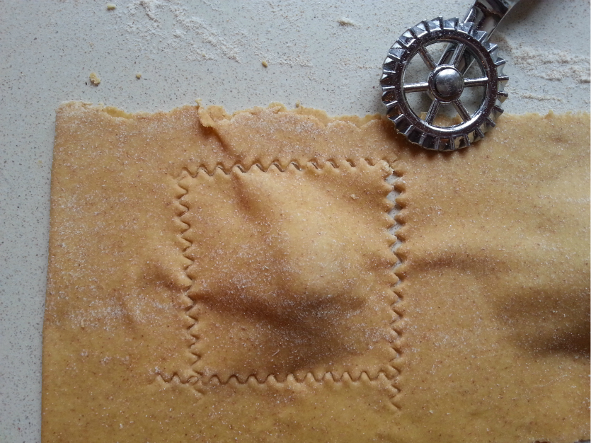 e ripiegate la sfoglia su se stessa e con l’aiuto della rondella dentata chiudete e tagliate la pasta in quadrati di cm 4 per lato, avendo avuto molta cura di far uscire l’aria ripassando i contorni con l’aiuto dei rebbi di una forchetta, in maniera da essere certi che non si aprano durante la cottura.