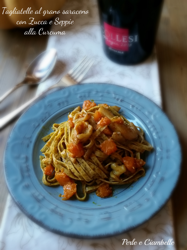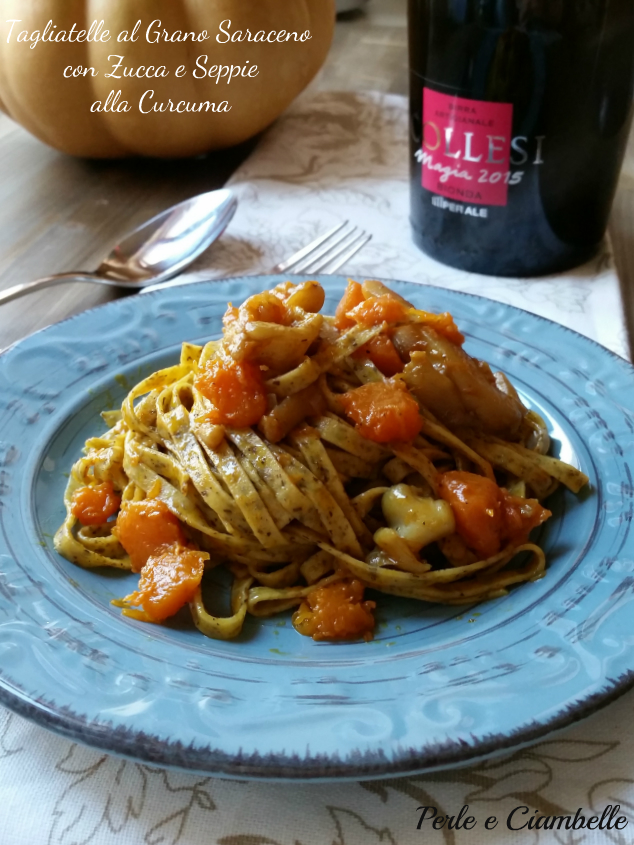 TAGLIATELLE AL GRANO SARACENO CON ZUCCA E SEPPIE ALLA CURCUMA